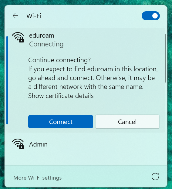 Click the Wi‑Fi icon in the taskbar. Choose Eduroam from the list of available networks and click Connect.